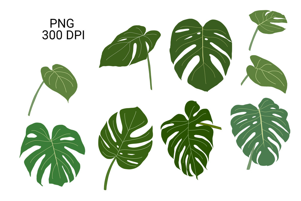 The Monstera Deliciosa is such a recognizable plant. Enjoy these illustrations of various Monstera leaves in various green hues and as silhouettes.